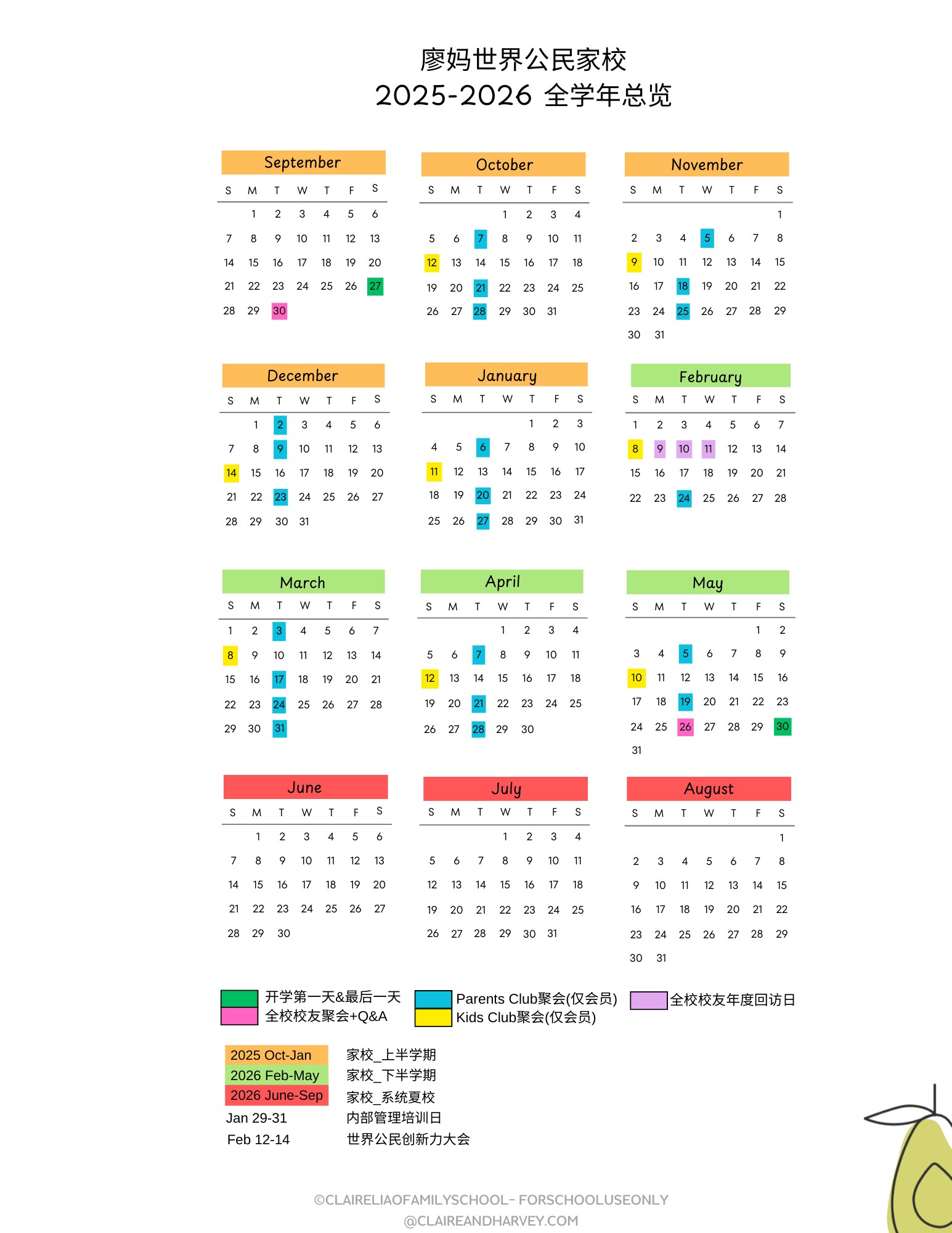 答:为了辅助大家的成长,可以参考25-26学年学校日历,跟着日历里蓝色标记和黄色标记日期上线就可以了。线上教室的链接,会在10月第一次会员聚会前统一发送。其余颜色的活动也都可以自选参加。